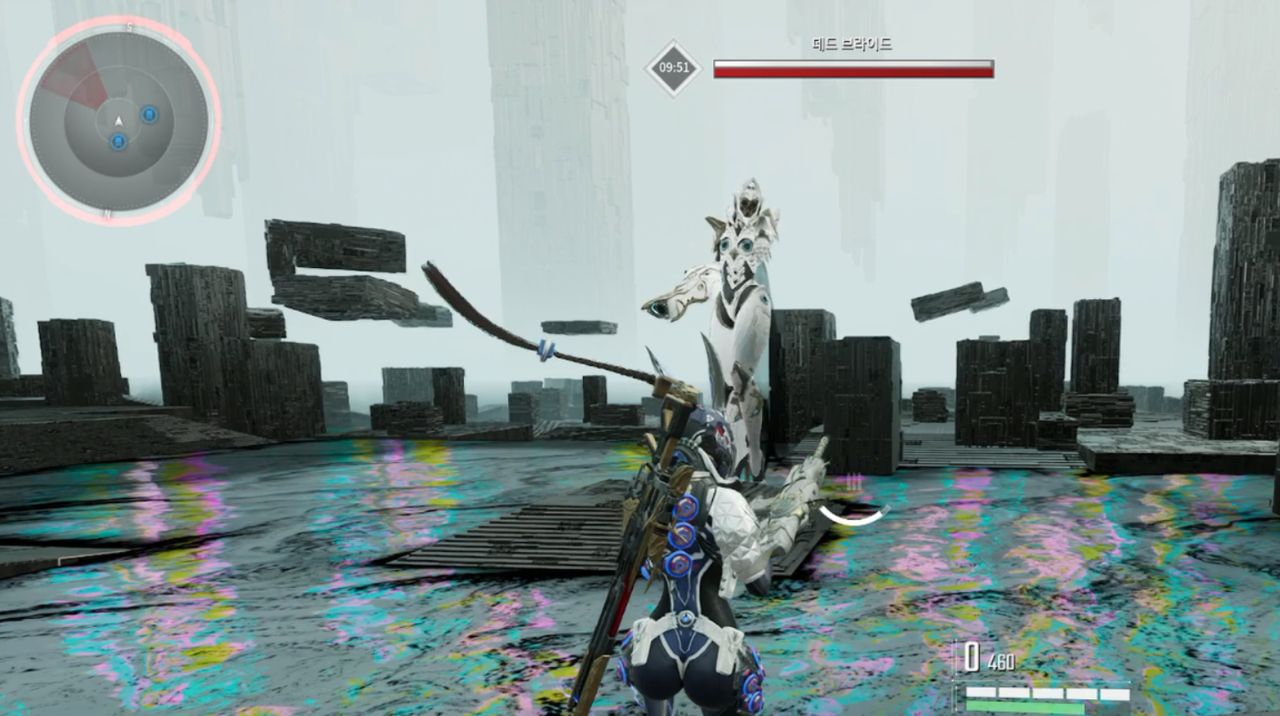 먼저 ‘데드 브라이드’를 만났다. 환경은 ‘퍼스트 디센던트’의 핵심 소재 철로 이뤄진 쇠기둥들이 군데군데 자리를 버티고 있다. 바닥에는 닿을 때마다 지속적으로 피해를 주는 물웅덩이가 존재한다. 요격전의 환경은 대부분 이런 식이다. 타고 오를 수 있으나 무너지기도 하는 기둥과 일부 특수 환경들이다.
