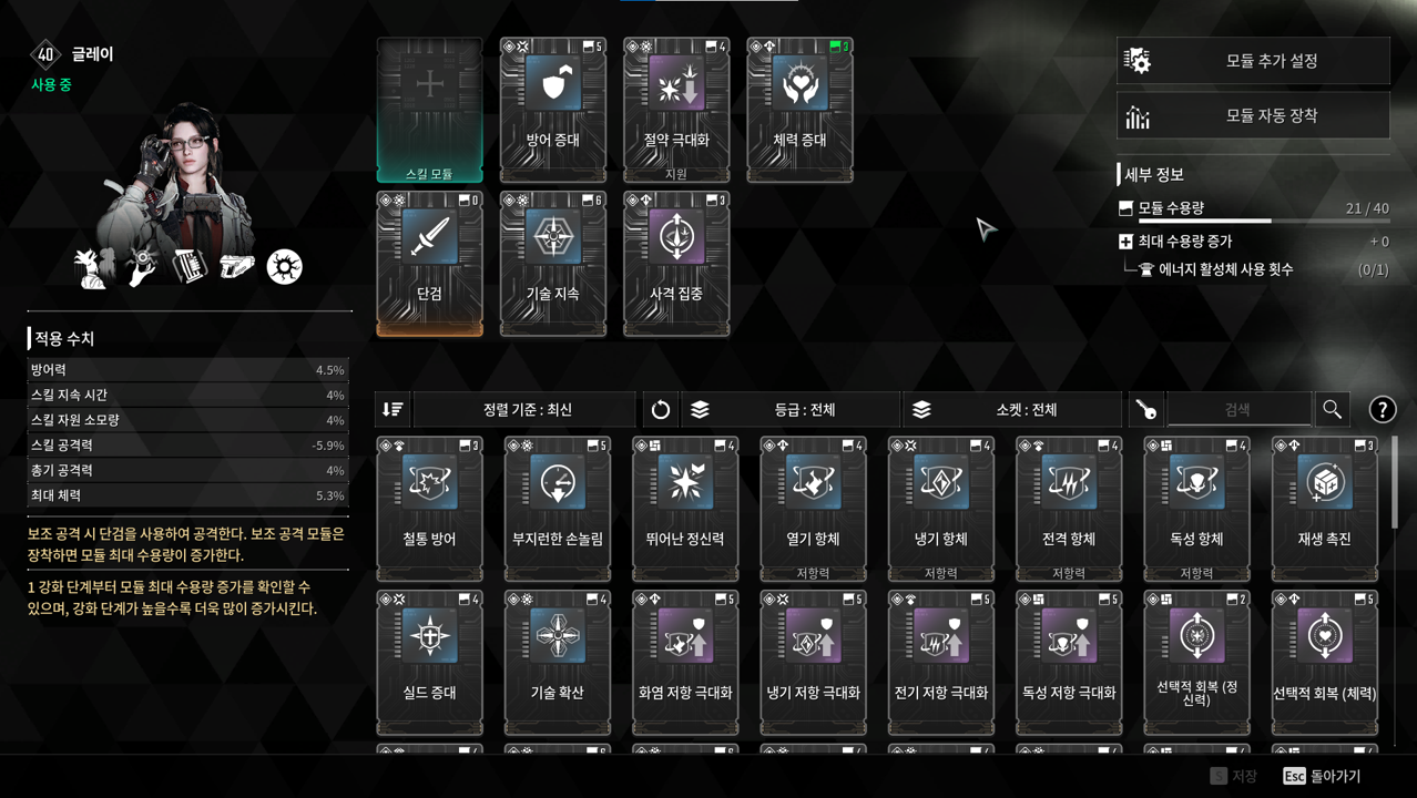 이 과정을 겪고 나면 당연히 빌드 최적화에 돌입한다. 보유한 계승자, 장비, 모듈 순으로 뜯어 보게 된다. 시연회에서 볼 수 있었던 ‘퍼스트 디센던트’의 계승자는 총 12종, 장비는 50여 종, 모듈은 300여 종이었다.