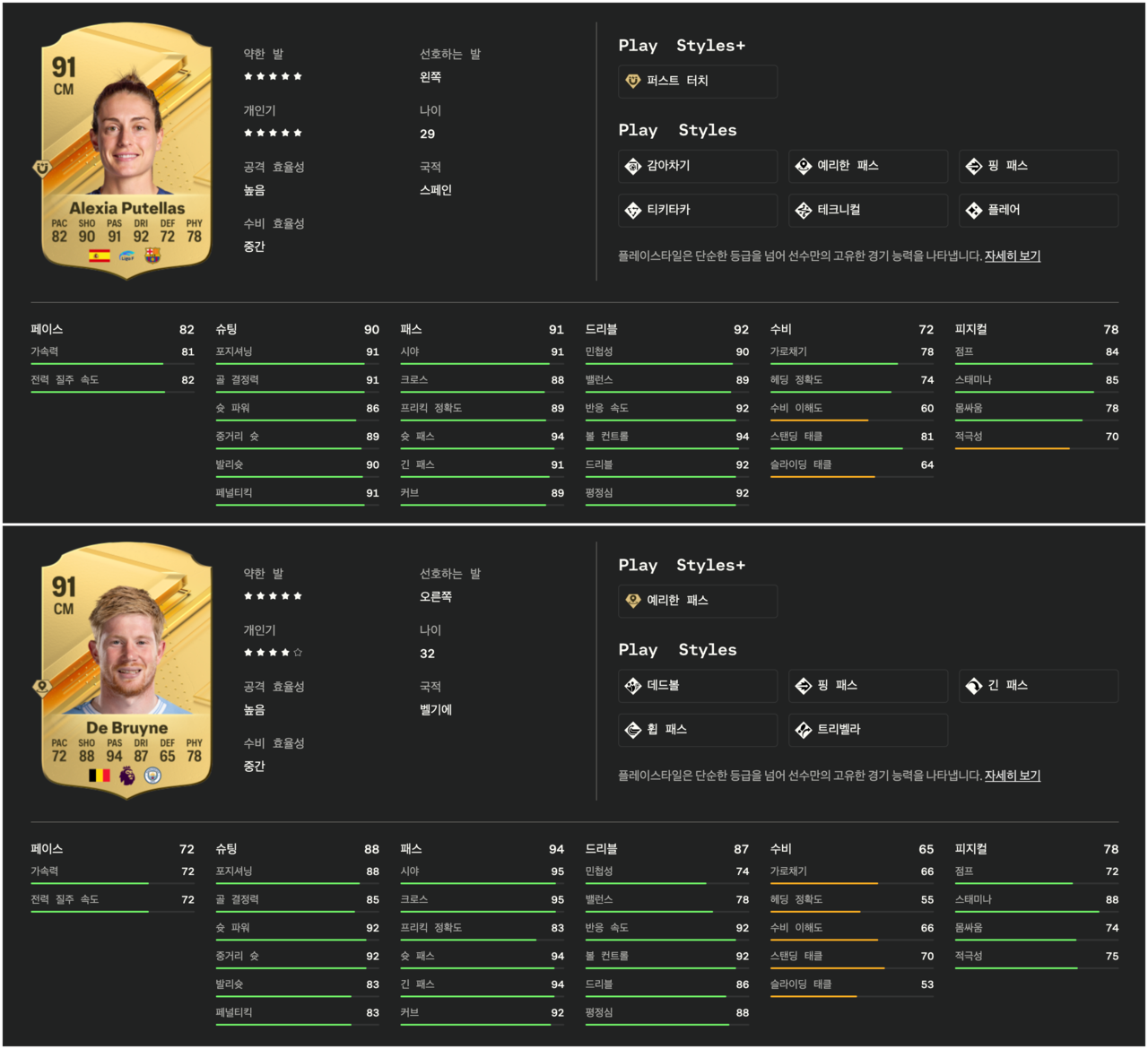 FC24의 공식 홈페이지에 공개된 선수들의 등급 리스트에 따르면, 포지션별 필수 능력치의 평균값을 의미하는 ‘오버롤(OVR)’ 수치가 가장 높은 선수에 ‘킬리암 음바페’, ‘엘링 홀란드’, ‘케빈 더 브라위너’와 함께 여성 선수가 ‘알렉시아 푸테야스’가 이름을 올렸다. 같은 중앙 미드필더(CM)인 알렉시아 푸테야스와 케빈 더 브라위너의 세부 능력치를 비교해 보면 푸테야스의 페이스(82)와 수비(72)가 브라위너에 비해 10점 이상 높다. 뒤이어 이름을 올린 여성 선수 ‘이타나 본마티’, ‘서맨사 커’ 등도 마찬가지다.