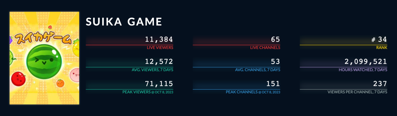 직관적인 게임 구성과 불합리한 물리 법칙에서 비롯된 높은 난도 사이의 부조화가 주는 신선함은 인플루언서는 물론 게임을 지켜보는 시청자들에게 새로운 재미를 선사했고, 덕분에 수박 게임은 인터넷 방송 분야에서 많은 관심과 사랑을 받고 있다. 실제로 세계 최대 스트리밍 플랫폼 트위치에 9월 처음 등장한 수박 게임은 지난 8일 총 151개 채널에서 동시 시청자 수 7만 명을 달성하며 건재한 인기를 증명하고 있다.