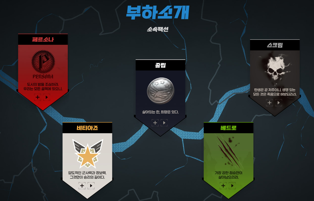 독특한 캐릭터성을 가진 부하를 수집해 건물과 영토를 점령해 세력을 넓혀나간다. 세력간 상성을 활용한 전략적인 전투 설계가 가능하고, 장소에 따라 다양한 콘텐츠를 경험하도록 해 정체성을 갖춘다.