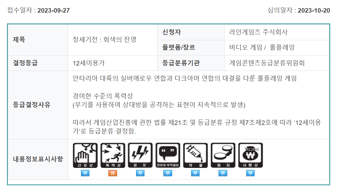 게임물관리위원회는 20일, 라인게임즈의 콘솔 신작 '창세기전: 회색의 잔영' 심의등급을 12세 이용가로 분류한다고 밝혔다. 사유는 경미한 수준의 폭력성이다. 무기를 사용해 상대를 공격하는 표현이 지속 발생하는 RPG가 일반적으로 받는 등급이다.