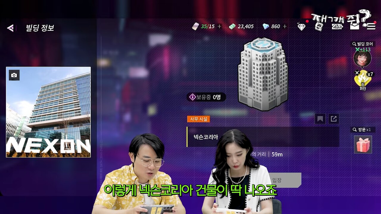 GPS 시스템을 채택하기 때문에, 자연스럽게 성남시 판교동에 자리잡은 넥슨코리아 사옥 옆이 본진으로 설정된 것을 확인할 수 있다. 넥슨 퍼블리싱 게임답게 넥슨코리아는 전설 빌딩이다. 건물을 터치하면 사무 시설로 표시되며, 실제 건물 사진과 빌딩 점령 시 얻는 코어 장비 정보를 알려준다.