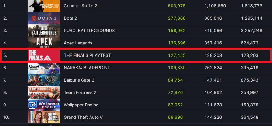[게임플] 넥슨의 자회사 엠바크 스튜디오가 개발 중인 신규 팀 기반 FPS 게임 ‘더 파이널스’가 크로스플랫폼 오픈 베타 테스트 하루 만에 스팀 최고 동시접속자 128,203명을 기록하고, 최다 플레이 게임 5위에 등극했다.