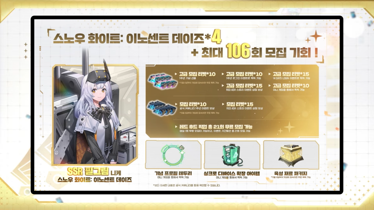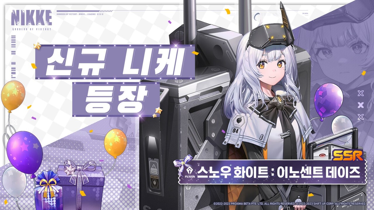 또다른 신규 니케 '스노우 화이트: 이노센트 데이즈'는 1주년 기념으로 모든 유저가 얻을 수 있는 배포 니케다. 필그림 니케가 무료로 지급되는 것은 출시 후 처음이다.