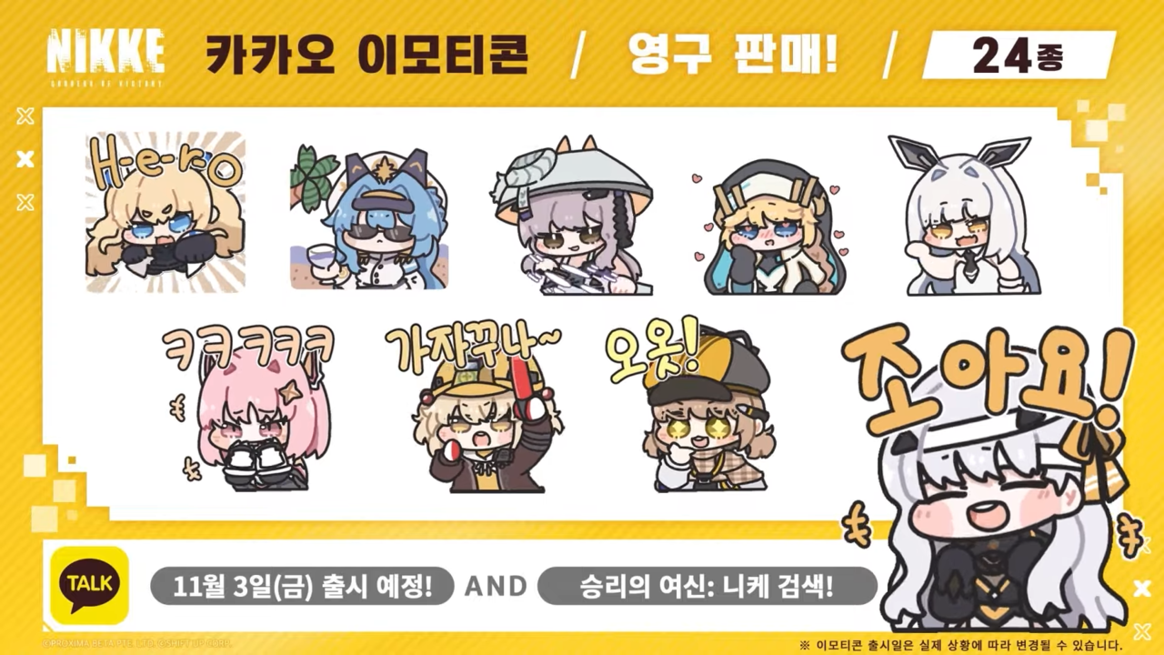 '니케'는 12월 2일과 3일 일산 킨텍스에서 열리는 AGF 2023에 참가하며, 현장에서 모더니아 1:1 피규어를 전시한다. 부스에서는 스페셜 공식 굿즈 판매와 코스플레이 무대 행사가 함께 펼쳐진다. 영구 판매되는 카카오톡 이모티콘은 11월 3일부터 구매 가능하다.