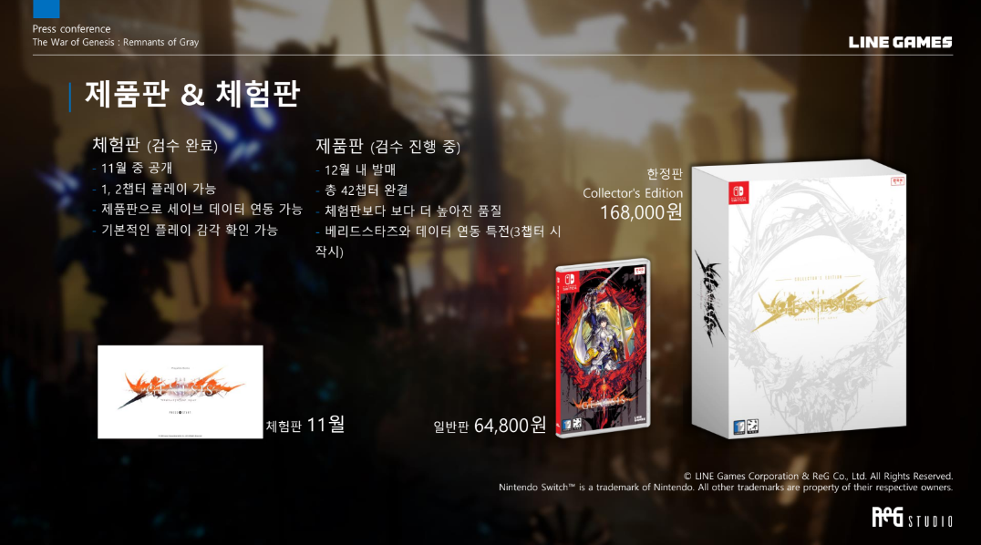 '회색의 잔영'은 닌텐도 스위치로 12월 출시되며, 11월 내 사전 체험판을 공개한다. 게임 도입부인 챕터 2까지 플레이가 가능하며 본편을 구매할 경우 체험판 게임 진행도를 이어나갈 수 있다.