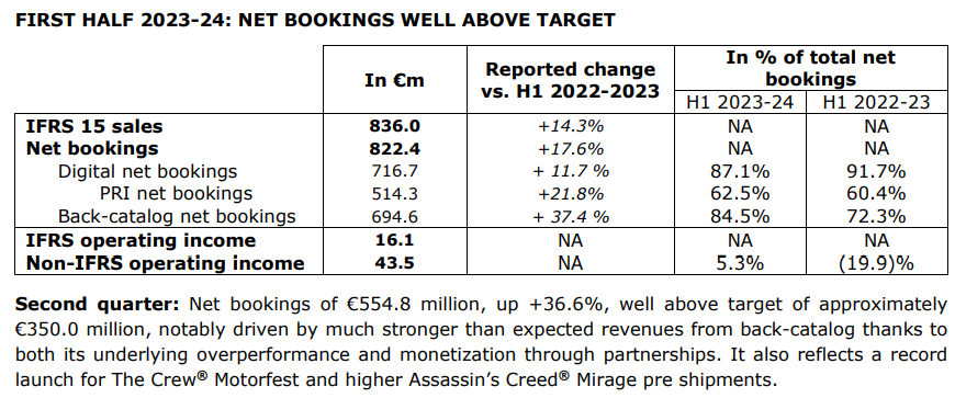 올해 초 실적 부진으로 스튜디오 규모 축소와 개발 취소 등을 단행하며 체질 개선에 나섰던 유비소프트는 최근 분기 실적 발표에서 한층 개선된 실적을 들고 왔다. 지난 26일 발표한 2023-24 회계연도 2분기 실적 발표에 따르면, 유비소프트의 넷 부킹(기간 내 판매 순금액)은 5억 5,480만 유로(약 7,915억 6,644만 원)로 전년 동기 대비 약 36% 증가한 수치다.