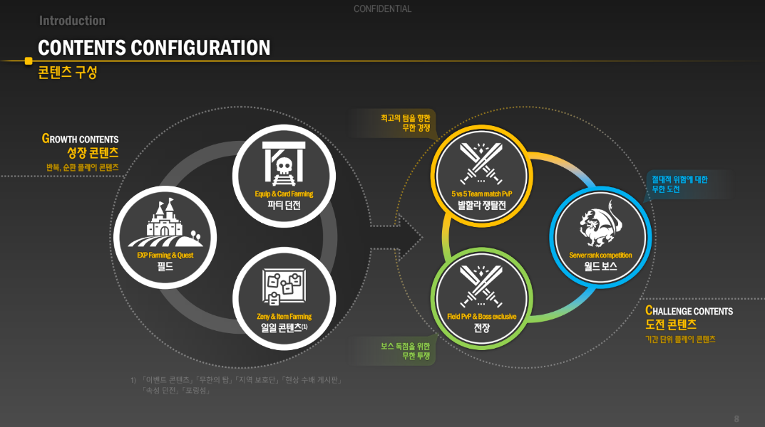 콘텐츠는 크게 성장과 도전으로 나뉜다. 필드와 파티 던전, 일일 콘텐츠가 성장이며 파티 던전이 특히 중요하다. 도전은 5:5 팀매치인 발할라 쟁탈전과 필드 PvP인 전장, 주간 랭킹이 존재하는 월드 보스로 구성됐다. 상품은 패스 상품을 중심으로 구성되며, 패스만으로 게임 플레이에 전혀 지장이 없다.