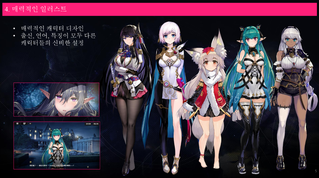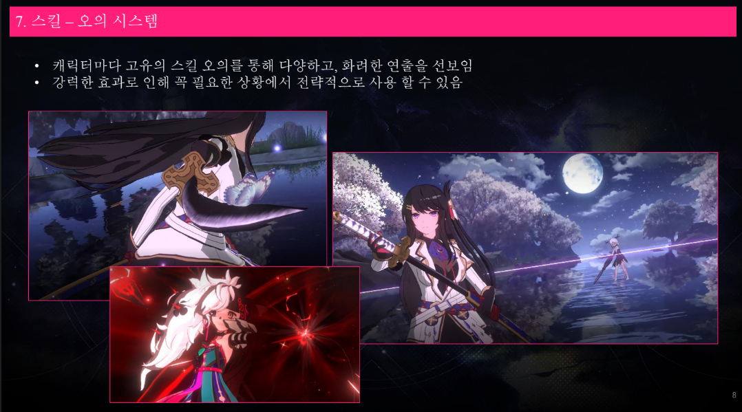 일러스트는 다른 게임에도 훌륭한 것들이 많아서 최고라고 말할 수는 없지만, 스킬 컷신이나 연계 스킬의 화려한 볼거리가 굉장히 만족스럽게 표현됐다. 이 부분을 조금 더 건드려서 한국 유저가 좋아하도록 수정하면 충분히 매력을 전할 수 있을 것이라 생각했다.