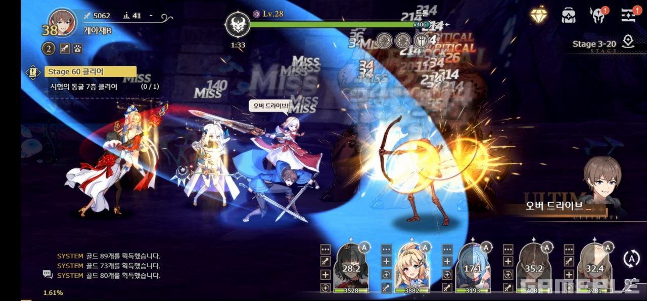 ‘스파클링 액션 RPG’라는 게임 소개에 걸맞게 게임의 전투는 화려하면서 속도감 있게 진행된다. 자동으로 진행되는 실시간 전투에서 유저는 상황에 따라 캐릭터가 가진 고유 스킬을 사용할 수 있다. 모든 캐릭터의 스킬은 2초 남짓한 길이의 애니메이션 컷신을 갖고 있다.