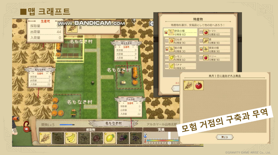 맵 크래프트는 무서진 다리를 고치거나 밭, 마을을 만들 때 사용한다. 카미바코만의 차별점이라고 할 수 있다. 만든 마을과 도시는 계속 발전시킬 수 있고, 서로 연결시켜 소재나 자원을 공유하는 교역 시스템도 존재한다.