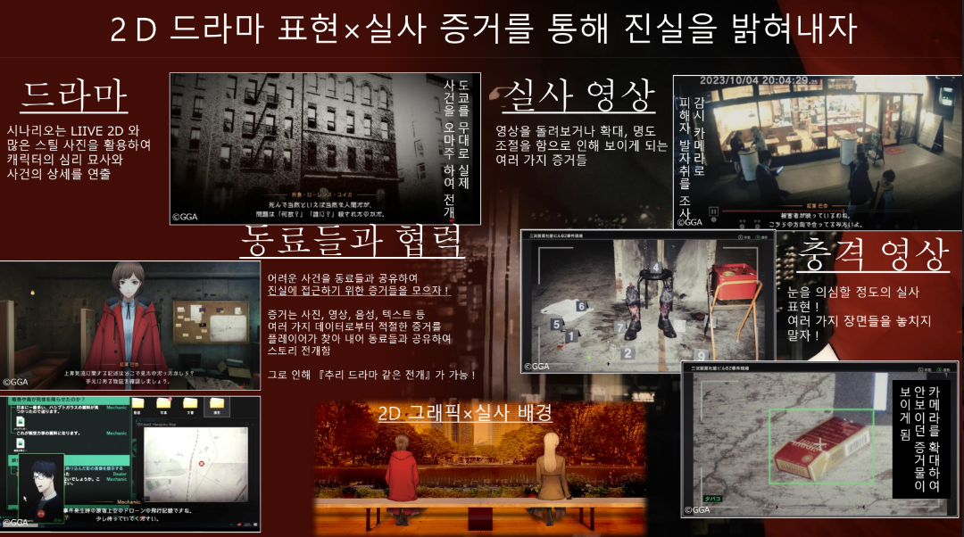 사건이 벌어졌을 때 이유는 무엇인지 의문이 주어지고, 유저는 증거 보드에 증거물 등 자료를 붙여서 가설을 나열해가며 게임을 진행한다. 직접 추리하며 사건의 진상에 다가가는 것이 게임의 핵심 매력이다. 2D 애니메이션과 실사 융합도 돋보이며, 전문적인 동료들과 자료를 공유해 함께 사건을 풀어나간다.