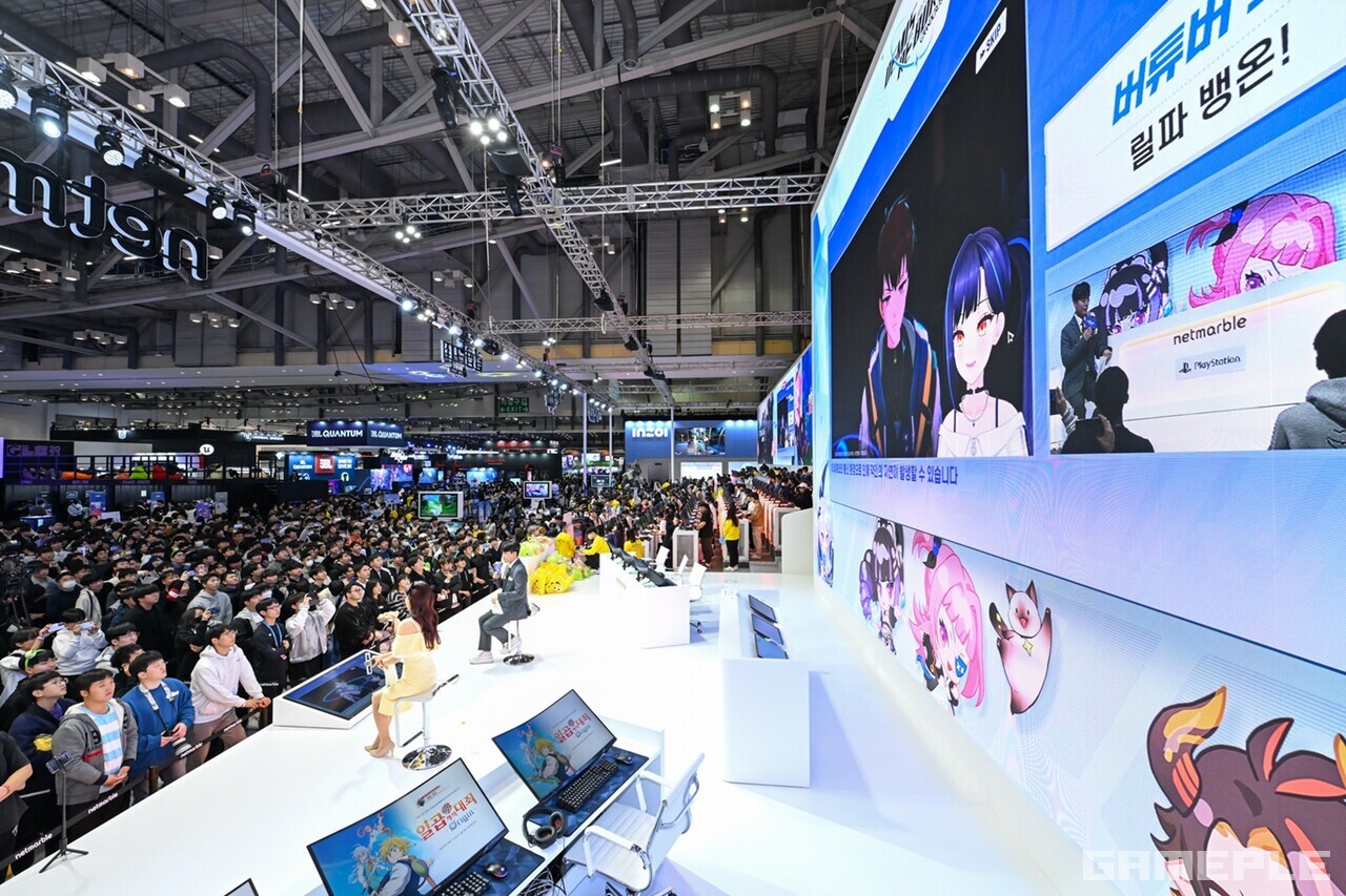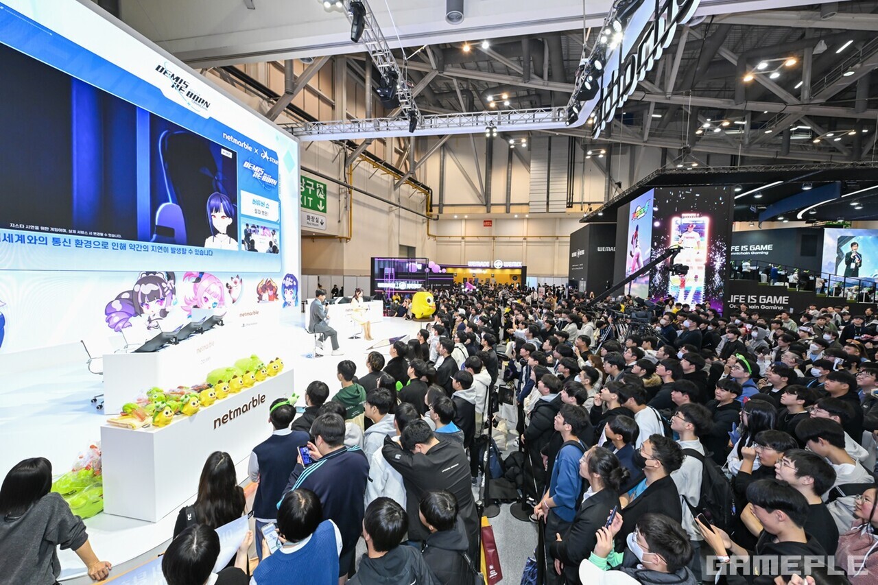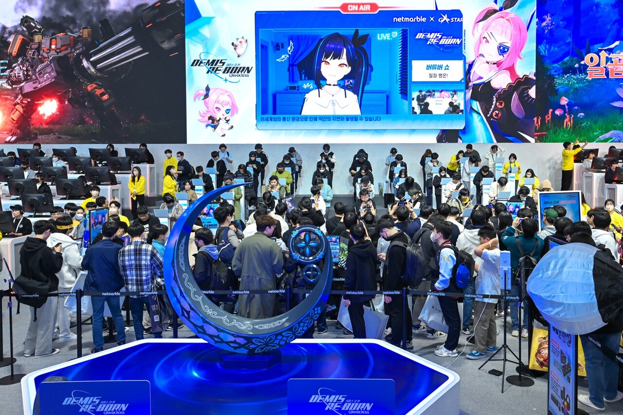 [게임플] 지스타 2023 현장에서, 넷마블이 이세계아이돌(이세돌) 멤버와 시연 행사를 기획해 '대박'에 성공했다.