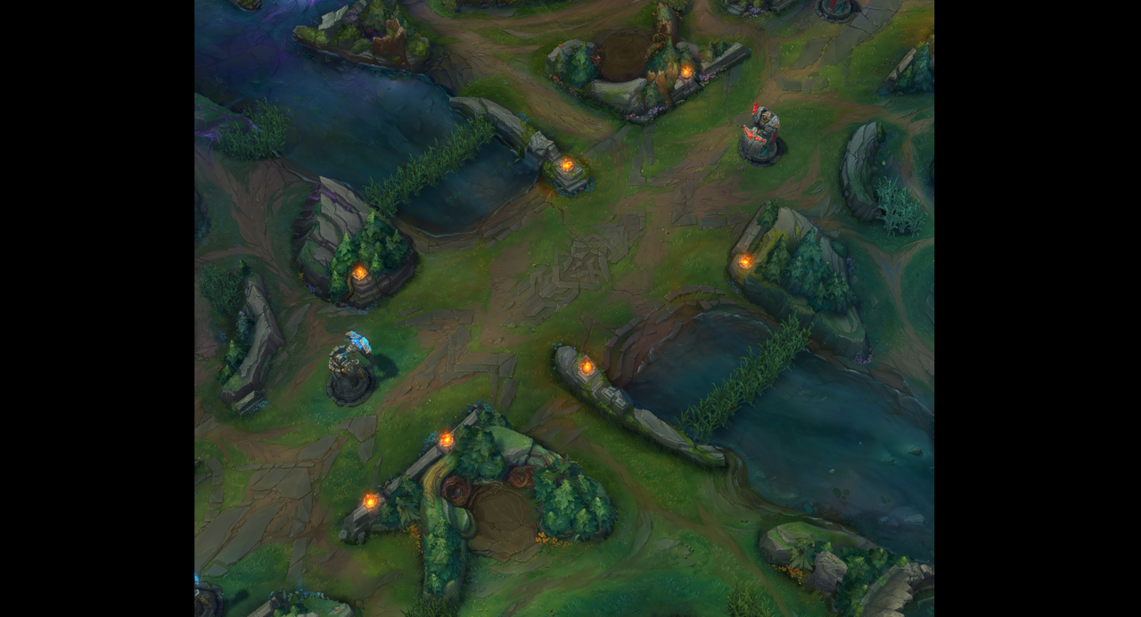 매튜: 맵의 지형과 카메라 앵글을 반영해서 문제들을 해결하고자 했는데, 근원적으로 카메라 앵글 상 블루가 유리할 수밖에 없다. '와일드 리프트'에 사용하는 카메라 솔루션을 'LoL'에 적용하는 것을 고려해볼 수 있지만, 지금은 일단 맵 지형이 한쪽이 우위를 가지는 것이 적합하지 않다고 판단해서 카메라 앵글과 상관없이 동일하게 만들었다.