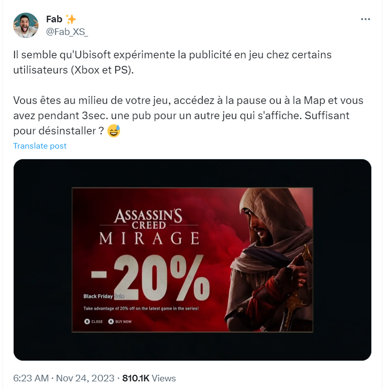 블랙 프라이데이를 맞아 다수의 게임사가 할인 행사에 열을 내고 있다. ‘어쌔신 크리드’ 시리즈로 유명한 유비소프트 역시 대형 퍼블리셔답게 큰 규모의 할인 행사를 진행 중이다. 게임 할인 광고는 특별한 것이 없지만, 논란이 된 것은 유비소프트가 패키지로 이미 판매된 게임에 중간 광고를 낸 것이 포착됐기 때문이다.