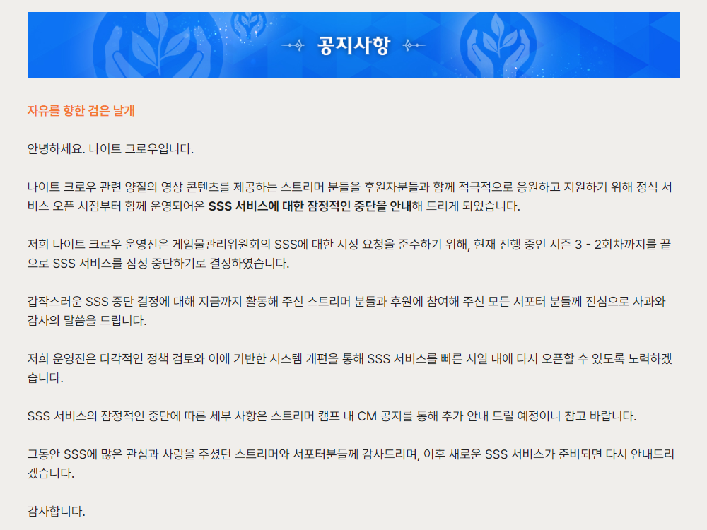 그런데 지난 23일, 나이트크로우는 게임위의 시정 요청으로 인해 현재 진행 중인 시즌 3를 끝으로 SSS의 서비스를 잠정 중단한다고 밝혔다.