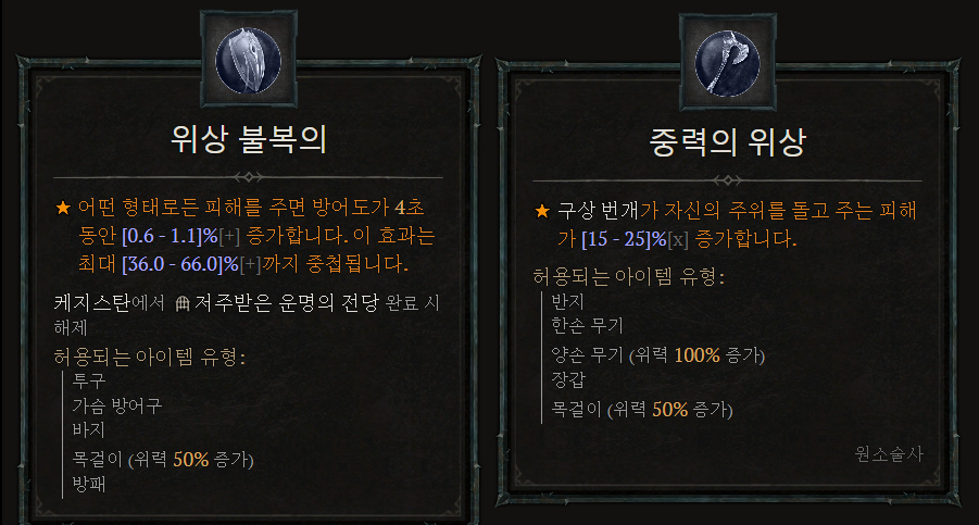 목걸에 ‘셀리그’를 사용하므로 불복의 위상을 가슴 방어구에 활용한다. 가슴 방어구의 옵션은 총방어도, 피해 감소, 근거리 또는 원거리 피해 감소, 보강 상태 피해 감소와 같은 피해 감소 옵션이 필요하다.