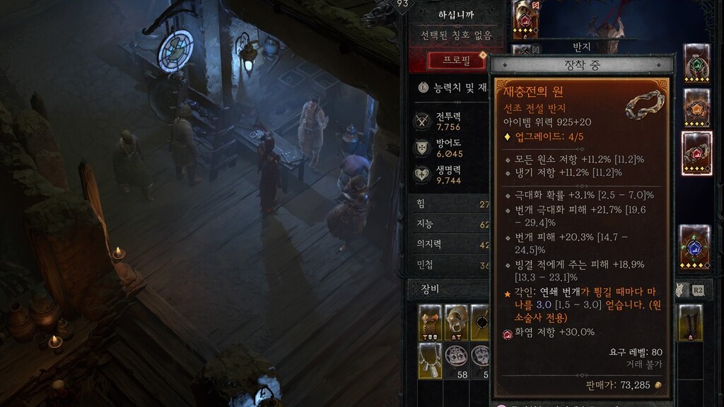 목걸이는 ‘셀리그’를 사용하고 반지로 ‘탈라샤의 오색찬란한 고리’를 사용한다. 탈라샤 반지는 기본 옵션이 상당히 준수하다. 여러 빌드에서 채용하지 않을 이유가 없는 반지다. 남은 반지에는 ‘재충전’ 위상을 채용하고 극대화 확률, 최대 마나, 자원 재생량 증가 등의 옵션을 사용한다.