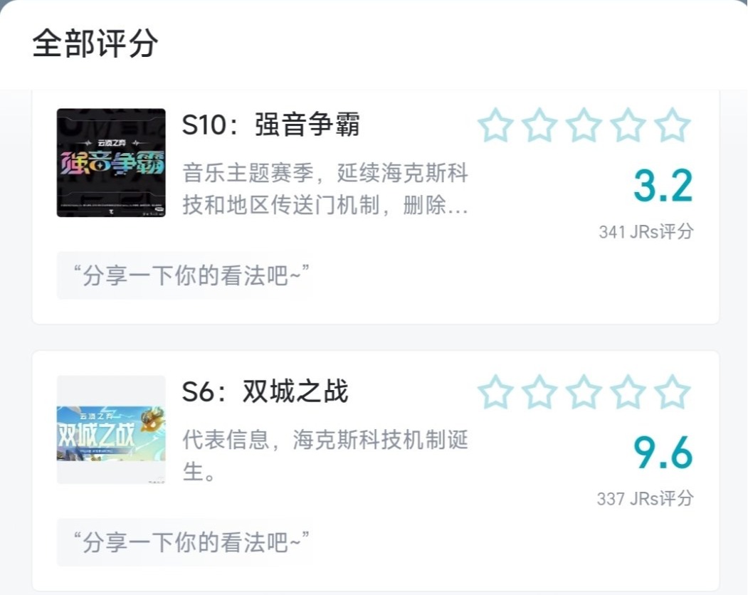 중국의 TFT e스포츠 캐스터 큐워즈태너(CuewarsTaner)는 지난 27일 자신의 X(트위터)에 TFT 세트별 중국 유저 평가 통계를 올렸다. 세트 10에 대한 중국 유저 평가는 10점 만점에 3.2점 기록이다. 가장 높은 점수를 받은 세트 6은 9.6점이다. 이전 시즌 세트 9는 6.3점을 받았다.