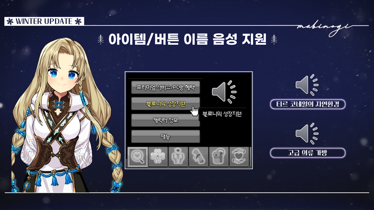 또, 꾸준히 나온 유저 의견을 적극 반영해 마우스 오버 시 버튼과 아이템명을 '블로니' 목소리로 들을 수 있는 음성 지원 기능을 도입한다. 시각장애 유저들에게 큰 도움이 될 기능이며, 국내 주류 게임 중 보기 드문 접근성 향상으로 주목을 받는다.