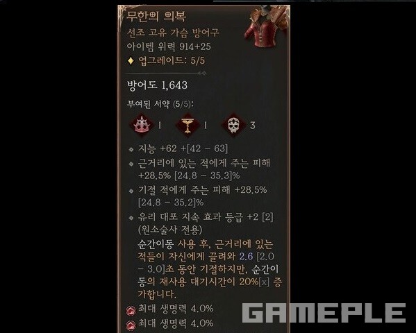갑옷은 ‘무한의 의복’을 사용한다. 무한의 의복 사용이 해당 빌드의 핵심으로 보인다. 근접 적 피해 증가, 기절 적에게 피해 증가, 유리 대포 지속 효과 등급 추가 등의 어픽스를 가지는 ‘무한의 의복’은 다소 공격적인 선택이다. 생존력은 높이면서 DPS를 높이기 위한 선택으로 보인다. 순간 이동 이후 3초간 30% 피해 감소를 얻는 ‘빛나는 순간 이동’가 도움이 되기도 한다.