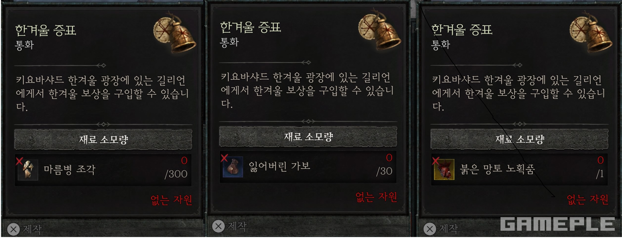 마름병 조각은 지옥 물결의 잉겅불과 비슷하다. 일반 몬스터와 정예 적을 처치하고 획득할 수 있다. 300개를 모아야 1개의 한겨울 증표로 교환된다. 잃어버린 가보는 필드에 스폰되는 일종의 토템인 ‘혹한 껍질’을 파괴해 얻을 수 있다. 30개를 모으면 1개의 한겨울 증표로 교환된다.