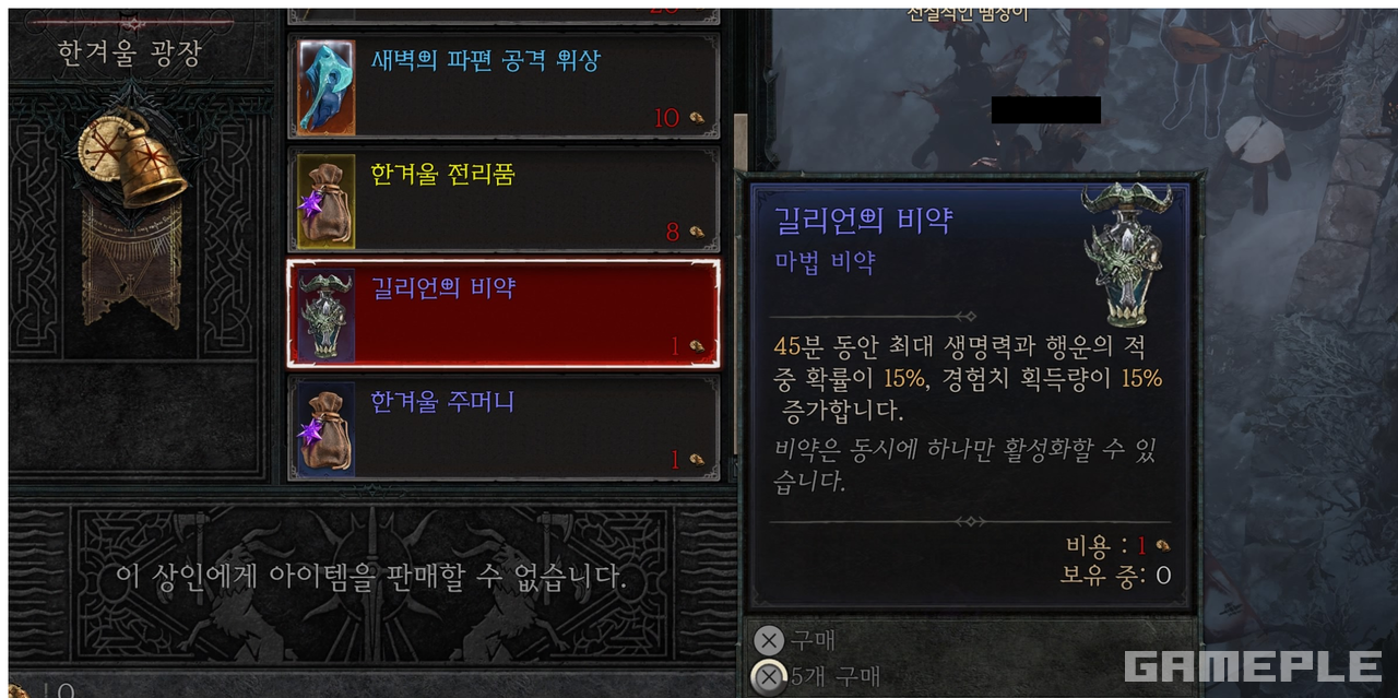 겨울 이벤트에서 가장 좋은 소비 아이템은 '길리언의 비약'이다. 최대 45분 동안 최대 생명력과 행운의 적중 확률이 15%, 경험치 획득량이 15% 증가한다. 좋은 능력치를 두루 갖춘 비약으로 지르의 도살장 도전에 도움이 될 것으로 보인다.