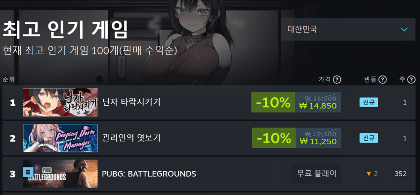 이번에 유통이 제한된 두 게임은 ‘닌자 타락시키기’와 ‘관리인의 엿보기’다. 성인 게임 전문 퍼블리셔 ‘망고 파티’가 유통을 맡은 두 게임은 각각 5만 장, 10만 장 판매고를 기록한 유명 게임으로, 특히 국내에서 큰 인기를 얻어 ‘배틀그라운드’와 ‘발더스 게이트 3’ 등을 제치고 스팀 내 국내 인기 게임 차트 1, 2위에 이름을 올린 바 있다.