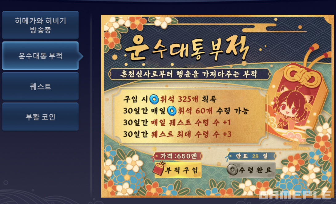 콜라보 아이템을 최대한 얻겠다는 의지를 가진 블루 아카이브 유저라면, 우선 빠르게 월정액 아이템인 '운수대통 부적' 구매를 권한다. 패키지가 없는 게임에서 유일한 효율 상품이다. 대신 다른 게임들의 월정액에 비해 상당히 저렴하고 효율이 높다.