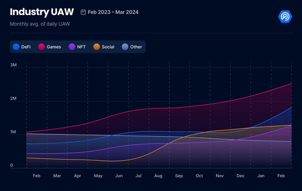 탈중앙화 어플리케이션(DApp) 마켓 플랫폼 ‘댑레이더’의 보고에 따르면 2024년 1분기 웹3 업계 전체 일일 고유 활성 지갑(dUAW)은 770만 개를 돌파했다. 이는 지난 분기 대비 77% 증가한 수치이다. 블록체인 게임 부문은 이전 분기보다 59% 증가한 210만 일일 고유 활성 지갑 수를 기록했다.
