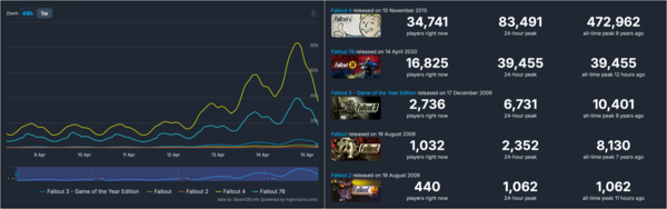 폴아웃 시리즈에 기반한 온라인 게임 ‘폴아웃76’은 지난 14일 최고 동시접속자 수 39,455명을 기록해 출시 6년만에 역대 최고 기록을 경신했고, 1998년 출시된 폴아웃2는 같은 날 1,000명의 동시접속자가 몰리면서 2009년 스팀 출시 이후 최고치를 기록했다. 최근 대규모 업데이트를 예고한 마지막 넘버링 타이틀 ‘폴아웃4’에도 85,000명에 달하는 이용자가 몰렸다.