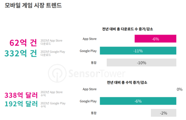 모바일 게임 시장 트렌드 분석 전문 기업 센서타워가 2일 '2024년 모바일 게임 현황' 보고서를 발간했다. 보고서는 2023년 모바일 게임 시장의 부진한 성적을 확인시켜 준다.
