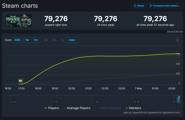 한편, 하데스2는 출시 9시간 만에 동시 접속자 수 79,000명을 기록하며 흥행을 이어가고 있다. 전작의 명성에 이어 이번 작품 역시 평론가와 이용자 모두에게 좋은 평가를 받고 있는 만큼, 하데스2의 흥행은 한동안 이어질 것으로 예상된다.