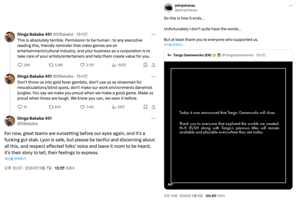 존 요하나스(John Johanas) 탱고 게임웍스 디렉터는 자신의 SNS에 “이렇게 끝을 맺는다. 안타깝게도 더 할 수 있는 말이 없다”는 말을 남겨 이용자들의 안타까움을 자아냈다.