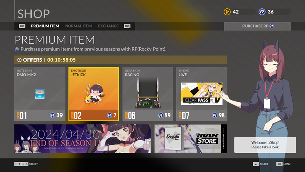 곡 플레이마다 얻는 플레이 포인트를 여기에서 사용할 수 있다. 다만 포인트는 하루 최대 획득 상한치가 존재한다. 스팀 지갑으로 구매하는 유료 재화 로키 포인트(ROCKY POINT)도 신설해 원하는 방식으로 구매가 가능하도록 한다.