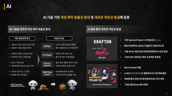 먼저 크래프톤이다. 크래프톤은 지난 8일 자사 IR 프레젠테이션 자료 한 면을 차지할 정도로 게임 개발과 AI 기술 접목을 비중 있게 다뤘다.