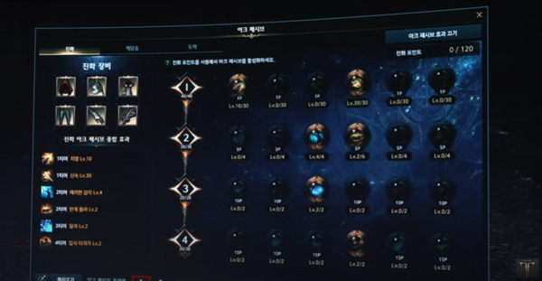 진화 탭에는 전 클래스 공통 패시브 효과로 구성됐다. 여기에는 장신구 특성, 세트 장비 효과까지 포함된 다양한 패시브 효과가 나올 예정이다. 캐릭터가 성장해 나가는 것에 맞춰 포인트, 특성에 따라 더 높은 특성을 찍거나 더 많은 특성을 찍으면서 성장하게 된다.