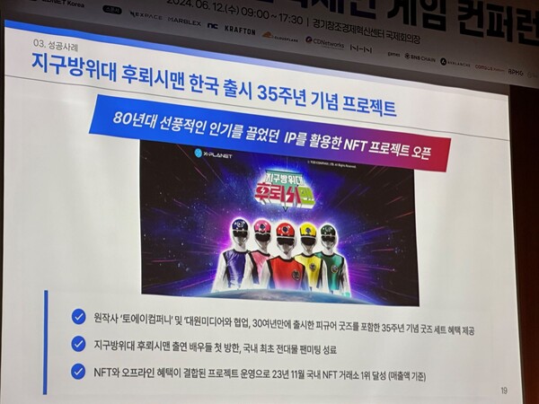 일례로 지구방위대 후뢰시맨 NFT 프로젝트가 소개됐다. NFT와 오프라인 혜택을 결합한 프로젝트 운영으로 23년 11월 매출액 기준 국내 NFT 거래소 1위를 달성했다.