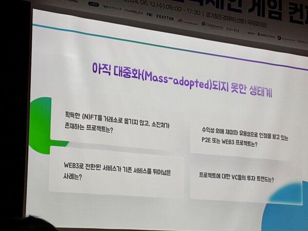 이어서 P2E와 웹3 서비스가 시장에 나온 이후 현주소에 대한 견해를 밝혔다. 결론부터 말하자면 아직 P2E, 웹3가 대중화되지 않은 상태다. 그는 네 개의 기준을 두고 그 이유를 설명했다.