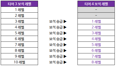 티어 3 보석을 티어 4 보석으로 계승할 수 있도록 보석 승급 기능이 추가된다. 보석 승급은 3레벨 보석부터 가능한데 이때 같은 종류의 보석으로만 승급이 가능하고, 승급이 완료되면 기존 보석 레벨에 따라 승급한 보석 레벨이 다음과 같이 조정된다.