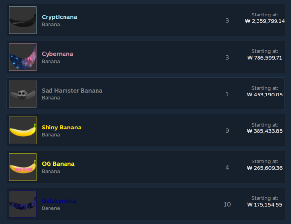 해당 게임에선 정해진 시간마다 무작위로 바나나를 얻을 수 있다. 이렇게 얻은 바나나는 스팀 내 장터를 통해 거래할 수 있는데, 그 특징이 서로 달라 특정 바나나의 경우 200만 원이 넘는 금액에 거래되기도 한다. 이 같은 사실이 알려지면서 이토록 단순한 게임에 발길이 몰린 것이다.