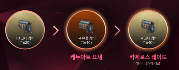 간단히 설명하면, 시즌3의 성장 루트는 다음과 같다. 먼저 T3 고대 장비로 아이템 레벨 1620을 달성해 케누아트 요새에 입장한다. 여기서 T4 유물 장비를 획득한 후, T3 장비의 강화 레벨을 계승해 아이템 레벨 1640까지 올린다. 이후 카제로스 레이드 1막에 도전해 T4 고대 장비를 획득하는 방식으로 진행된다.