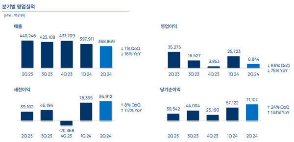 매출과 영업이익은 전분기 대비 각각 7%, 66% 감소하고, 전년 동기 대비 16%, 75% 줄었다. 당기순이익은 전분기 대비 24%, 전년 동기 대비 133% 증가했다.