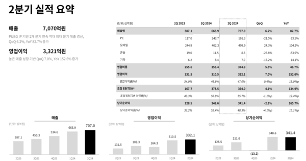 크래프톤은 2분기에 7,070억 원의 매출을 기록하며 분기 최대 실적을 달성했다. 이는 전년 동기 대비 82.7%, 전 분기 대비 6.7% 증가한 수치로, 괄목할 만한 성장세를 보여줬다. 분기 실적을 견인한 것은 크래프톤의 대표 IP 'PUBG: 배틀그라운드'(이하 배틀그라운드)다.