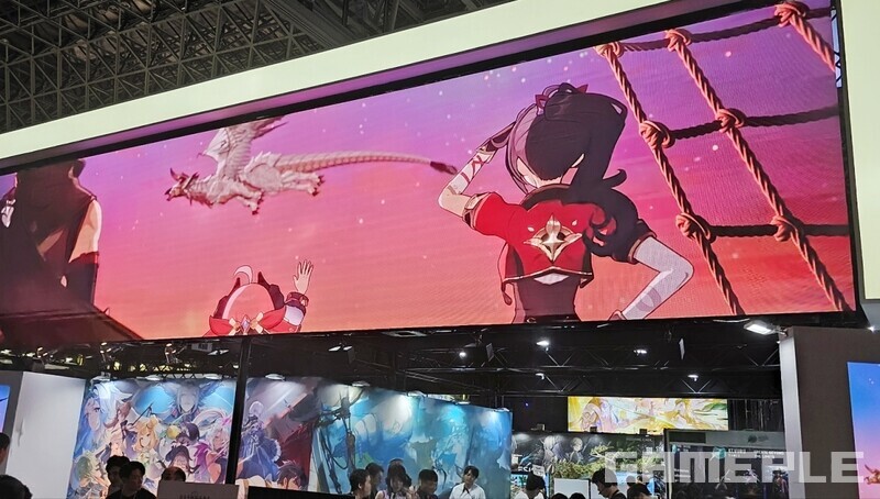 부스 전면에 역동적으로 출력되는 애니메이션 트레일러가 시선을 사로잡는다. 안쪽은 적극적으로 부채를 나눠주는 부스걸, 공간을 최대한 활용한 전시물이 눈에 띈다. 특히 게임 핵심 매력인 캐릭터를 부스 사방에서 효율적으로 노출한다.