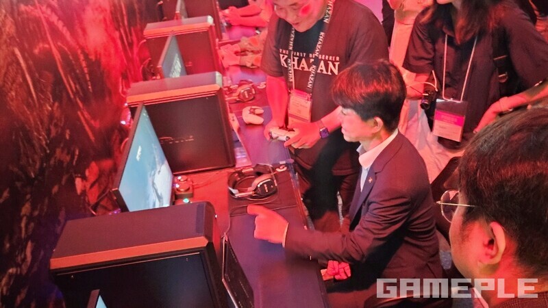 용 차관은 27일, 일본 치바현 마쿠하리 멧세에서 열린 TGS 2024 현장을 찾았다. 넥슨 부스에서 자회사 네오플의 윤명진 대표와 만나 잠시 대화를 나눈 뒤, 시연대에 앉아 네오플이 개발 중인 대형 출품작 '퍼스트 버서커: 카잔'을 잠시 체험하는 시간을 가졌다.