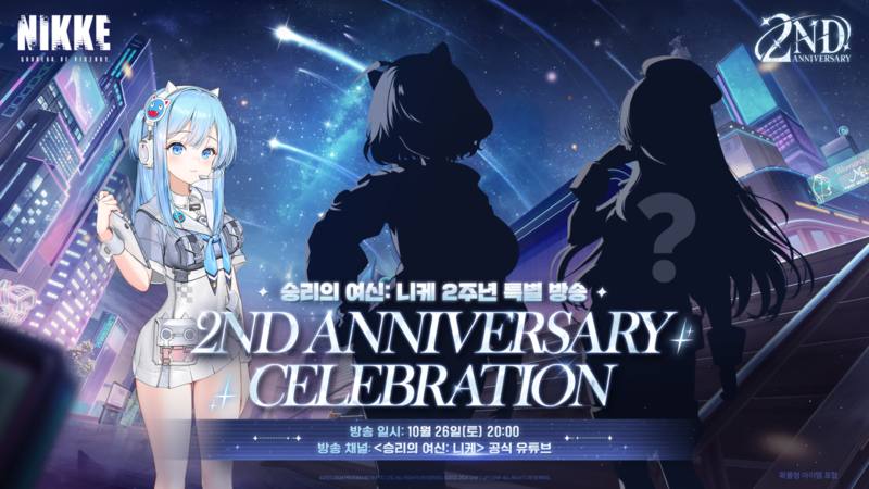 '니케' 2주년 방송은 10월 26일(토), 오후 8시 시작한다. 현재 유튜브 각 언어별 공식 채널에 실시간 스트리밍 페이지가 오픈됐으며, 알림 받기를 통해 방송이 열리는 즉시 시청 및 실시간 채팅이 가능하다.