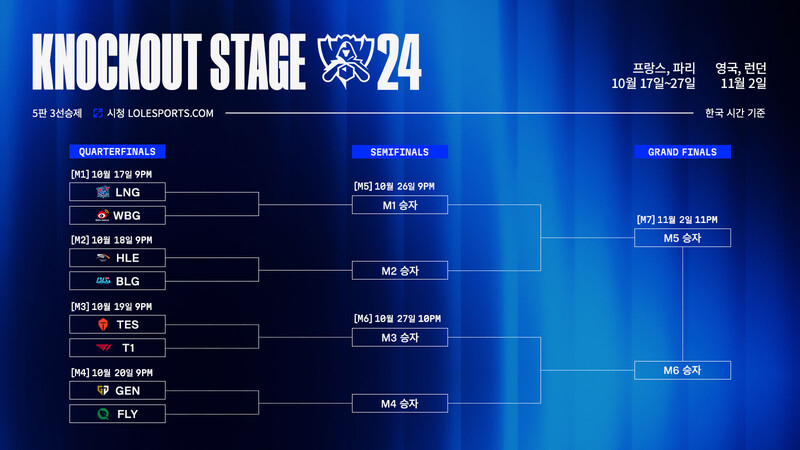 라이엇게임즈가 주관하는 '리그 오브 레전드' 2024 월드 챔피언십(이하 월즈)가 10월 17일부터 8강 녹아웃 스테이지에 접어든다. LNG e스포츠와 웨이보 게이밍(WBG)의 대결로 시작되며, 하루에 한 매치씩 5전 3선승제 승부를 펼친다.