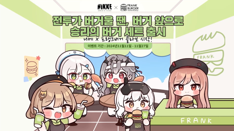 먼저 11월 11일부터 27일까지 '프랭크버거'와 콜라보를 실시한다. 전국 매장에서 니케 콜라보 세트를 판매하며, 구매 보상으로 스페셜 포토 카드와 키링 및 인게임 쿠폰을 얻는다. 그중 12개 특별 매장에서는 '니케' 랩핑을 진행한다.